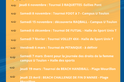 Le Sport U Campus Toulon te propose un programme 2025-2026 plein d’énergie, de fun et de rencontres ! Au programme cette année : Tournoi 3 Raquettes _ Jeudi 6 novembre Inscription ici Foot... Pour en savoir plus
