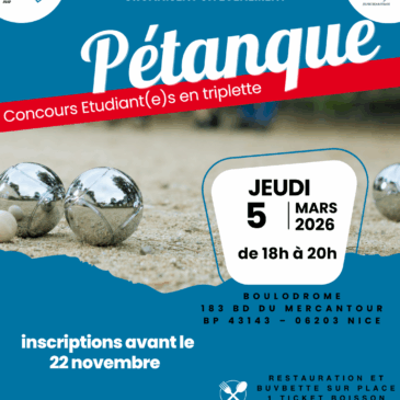 Concours étudiant(e)s de pétanque à Nice – 27 novembre 2025 Viens découvrir ou redécouvrir la pétanque dans une ambiance conviviale ! Boulodrome du Mercantour – de 14h à 20h Format triplette – nombre de places limité Inscription obligatoire avant le … Lire la suite