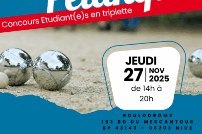 Concours étudiant(e)s de pétanque à Nice – 27 novembre 2025 Viens découvrir ou redécouvrir la pétanque dans une ambiance conviviale ! Boulodrome du Mercantour – de 14h à 20h Format triplette – nombre... Pour en savoir plus